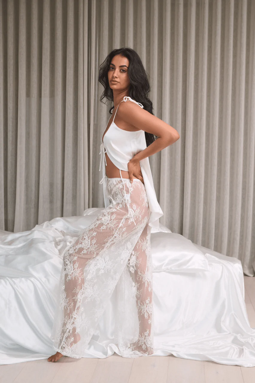 Made for statement moments, the Lottie Pant in Ivory features a soft sheer lace with a loose, oversized silhouette. Designed for effortless layering, this versatile style transitions seamlessly from lounging at home to out at night.Â